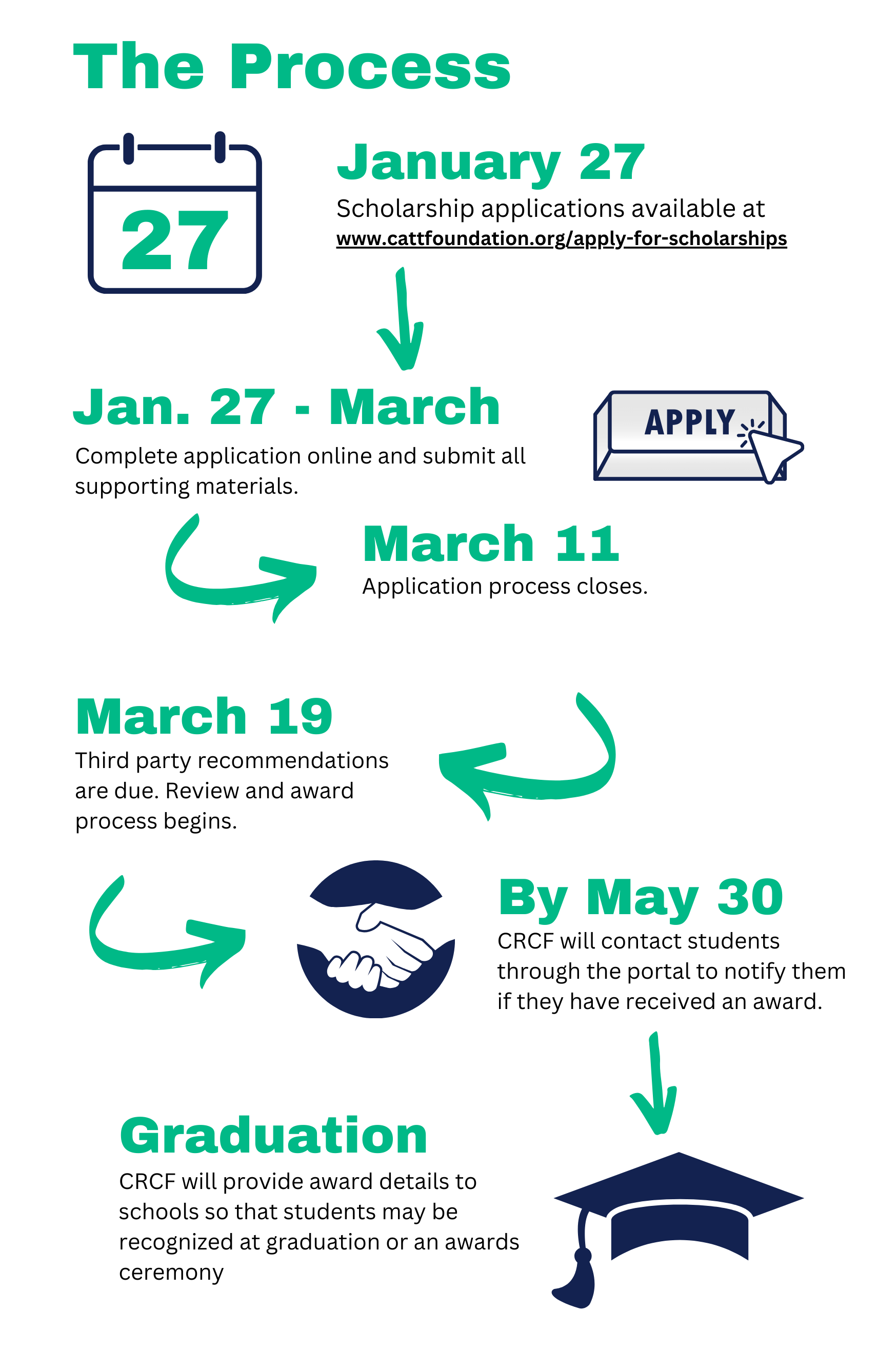 - By May 30 - Students will be notified by CRCF if they are receiving scholarships. Scholarship info will be sent to students' respective schools to be announced at award or graduation ceremonies.